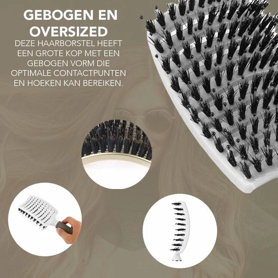 Gebogen en Oversized Head – Deze haarborstel heeft een grote kop met een gebogen vorm die optimale contactpunten en hoeken kan bereiken.