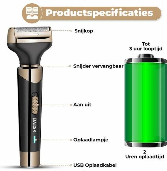 De opzetstukken zijn speciaal ontwikkeld voor het specifieke doel van het opzetstuk De opzetstukken van BAESS geven je de mogelijkheid om je oren, neus, baard en wenkbrauwen te trimmen met een enkele trimmer. Het draaiende scheersysteem is zo gemaakt dat verkeerd scheren bijna onmogelijk is, dit maakt de trimmer ideaal voor dagelijks gebruik. De meegeleverde opzetstukken zijn waterdicht, wat u de mogelijkheid geeft om deze te gebruiken op een natte huid. Niet alleen is het handig voor het scheren van een natte huid, ook het schoonmaken is zo gedaan. Plaats de opzettenstukken even onder de kraan en zij zijn met enkele ogenblikken haarvrij. LET OP: De trimmer is niet waterdicht.