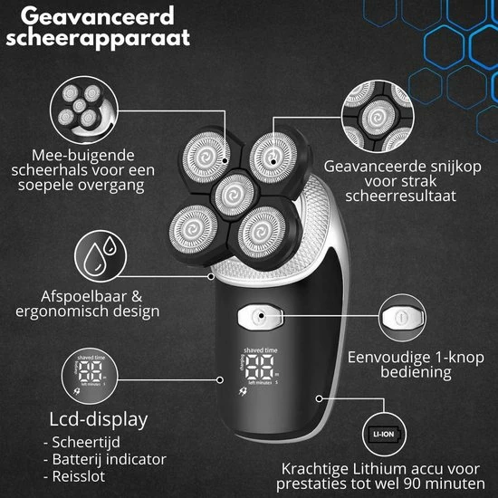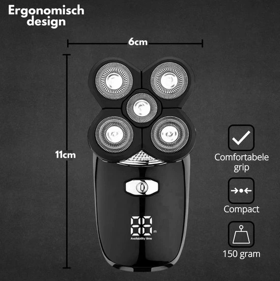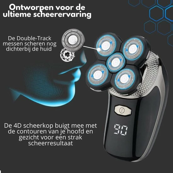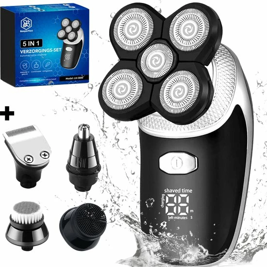 Genieten van draadloos nat en droog scheren met een glad scheerresultaat? Met het Beeperfect® 5-in-1 scheerapparaat kan het! De 4D flexibele scheerkop met 5 roterende mesjes zorgt voor een soepele overgang en creërt de ultieme scheerervaring, waarmee je niet alleen je gezicht, maar ook je hoofd perfect glad mee scheert. De 5 verwisselbare opzetstukken bieden je een complete verzorging voor heel het lichaam, waardoor je niks anders meer nodig hebt. De krachtige accu gaat zo’n 90 minuten mee en met het intelligente display weet je precies hoeveel minuten je nog over hebt en wanneer het nodig is om te reinigen.