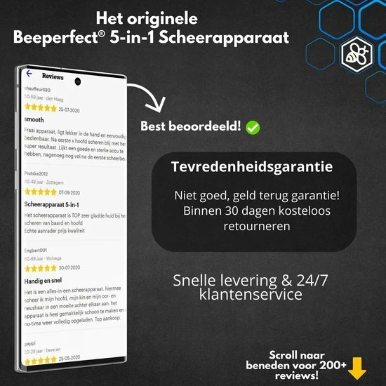 Voortaan met een krachtig all-round scheerapparaat je gezicht bijhouden hoe jij het wilt? Druk dan op “In winkelwagen” en geniet al snel van het Beeperfect® 5-in-1 scheerapparaat! Niet tevreden? Binnen 30 dagen kun je altijd kosteloos retourneren.