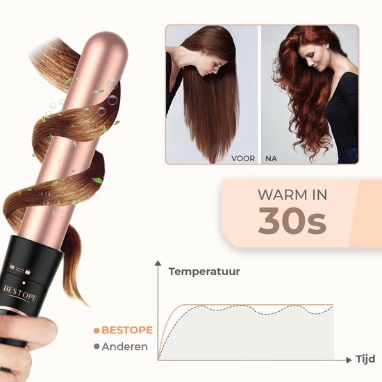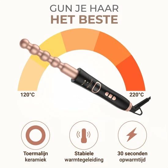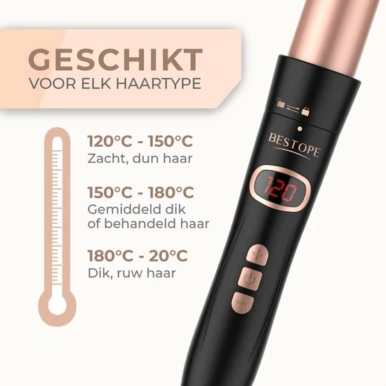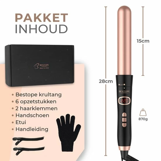 Wanneer de krultang niet gebruikt wordt, schakelt het product zichzelf na 60 minuten uit. De warmtebestendige handschoen is aan te raden om te dragen voor je veiligheid. De temperatuur is verder af te lezen op het lcd-scherm en handmatig in te stellen van 120°C tot 220°C.