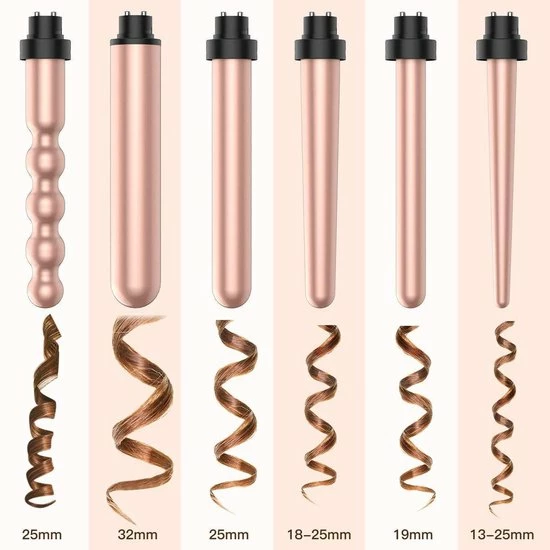 De krultang is geschikt voor elk haartype door de verwisselbare opzetstukken. Elke soort krul is te vormen door de opzetztukken met de volgende diameters: