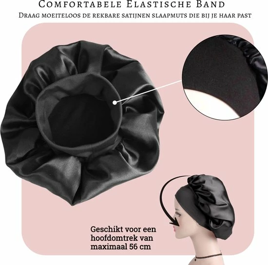 - Pasvorm – De comfortabele elastische band zorgt ervoor dat de slaapmuts netjes op zijn plaats blijft. Bovendien maakt het niet uit of je haar gekruld, afro, stijl, of getextureerd is. De slaapmuts is geschikt voor ieder haartype, en haarlengte!