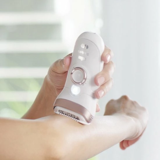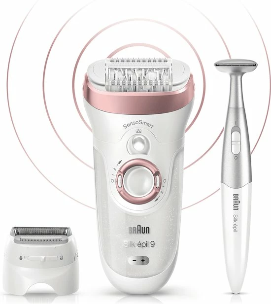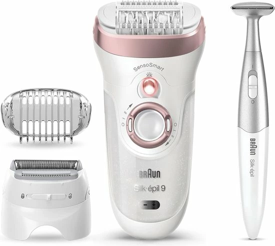 Silk-épil 9, met een brede kop voor een snellere epilatie en ultrasnelle resultaten. Hij heeft extra opzetstukken voor het scheren, trimmen en epileren voor een huid die weken glad blijft, en niet slechts enkele dagen.