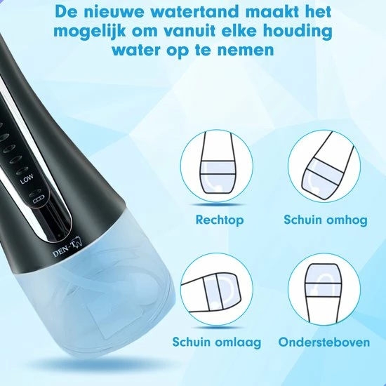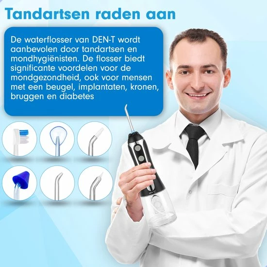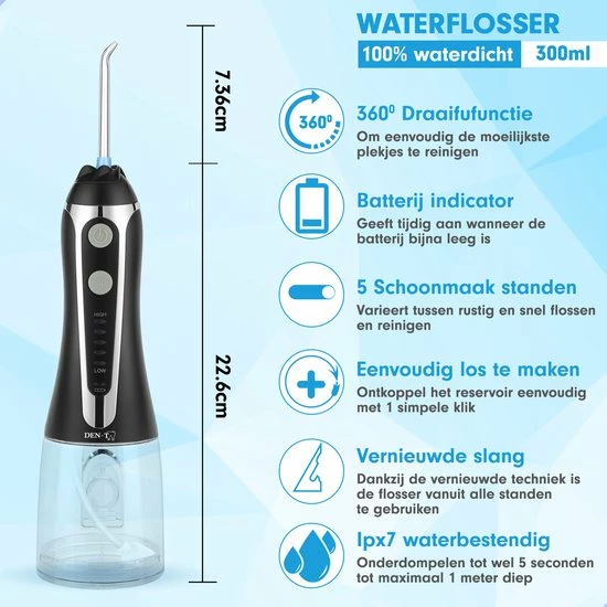 DEN-T® Waterflosser PRO V500 – 300ML – 5 Standen – 10 Opzetstukjes – Monddouche – Flosapparaat – Zwart –
