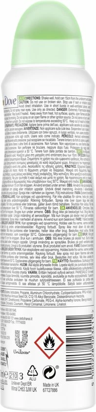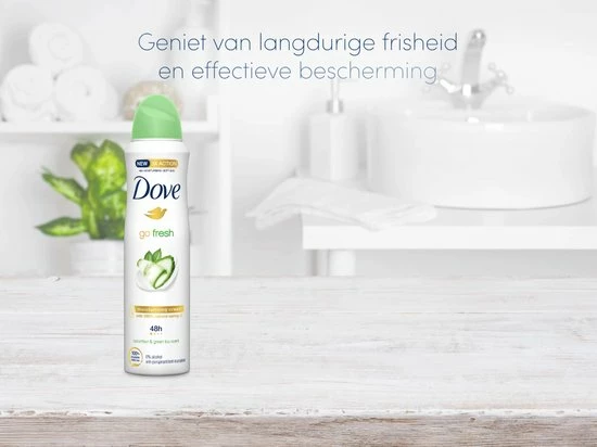 Dove Go Fresh Cucumber & Green Tea Anti-Transpirant Deodorant Spray is ontwikkeld omdat er niets boven een frisse geur gaat die je ‘s morgens meteen laat stralen. De Go Fresh anti-transpirant combineert de heerlijke geuren van komkommer en groene thee met de vertrouwde bescherming van Dove. Het is precies wat je nodig hebt om ‘s ochtends de dag verfrist en verzorgd te beginnen, vol vertrouwen voor de rest van de dag. Maar het is niet alleen de verfrissende geur die de Dove Go Fresh Cucumber & Green Tea Anti-Transpirant Deodorant Spray zo’n goede keuze maakt. Onze betrouwbare formule heeft een drievoudige werking: de anti-transpirant biedt tot 48 uur bescherming tegen zweet, bevat 1/4 hydraterende crème met 100% natuurlijke oliën en helpt om je gevoelige huid te herstellen van irritatie veroorzaakt door het scheren. Je krijgt prachtig zachte en gladde oksels in slechts drie dagen. Dus houd je Dove Go Fresh Cucumber & Green Tea Anti-Transpirant Deodorant Spray in de buurt als je ‘s ochtends uit de douche stapt en houd je oksels zacht en verzorgd met Dove anti-transpirant.