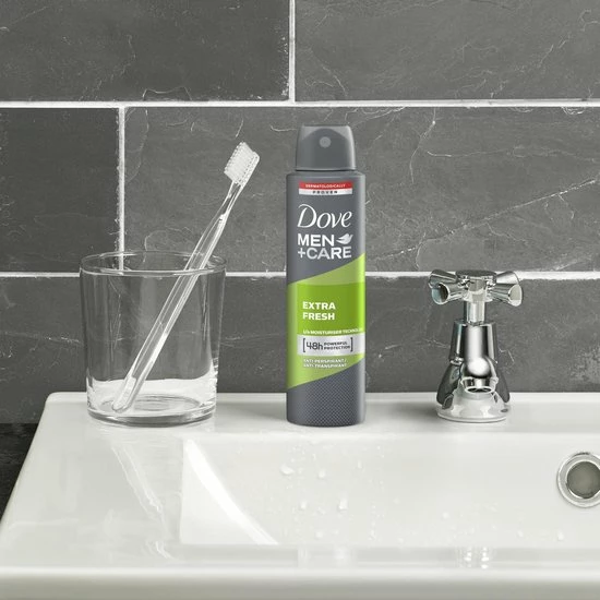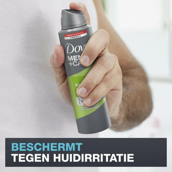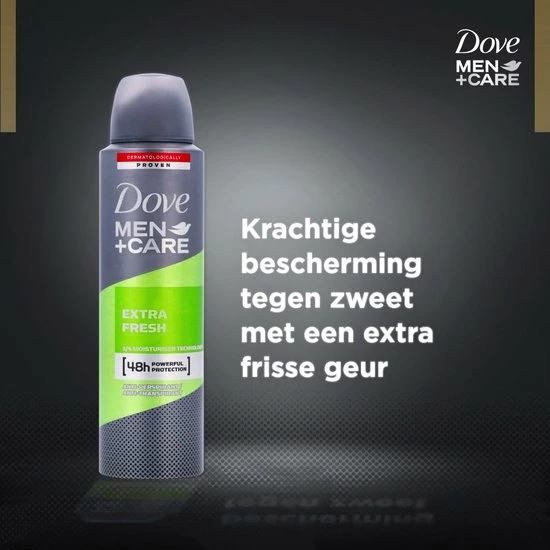 Dove Men+Care anti-transpirant spray is hard tegen zweet, maar zacht voor de huid. Als je regelmatig onderweg bent en veel sport, waardeer je het gemak van een langdurig werkende deodorant spray. Dankzij de dermatologische geteste formule van Dove Men+Care Extra Fresh anti-transpirant spray ben je tot 48 uur krachtig beschermd tegen zweet en ongewenste lichaamsgeuren. Bovendien bevat het de 1/4 hydraterende crème van Dove, die de huid verzorgt en beschermt tegen irritatie onder de oksels. Het extra frisse parfum is de hele dag subtiel aanwezig. Geen compromissen op het gebied van kwaliteit, kracht of comfort.