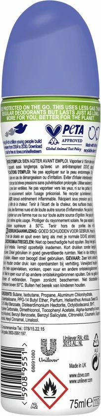 | Ingrediënten | Butane, Isobutane, Propane, Aluminum, Chlorohydrate, PPG-14, Butyl, Ether, Cyclopentasiloxane, Parfum, Disteardimonium, Hectorit, Helianthus, Annuus, Seed, Oil, C12-15, Alkyl, Benzoate, Octyldodecanol, BHT, Dimethiconol, Propylene, Carbonate, Tocopheryl, Acetate, Citric, acid, Alpha-Isomethyl, Ionone, Benzyl, alcohol, Benzyl, Salicylate, Citronellol, Coumarin, Eugenol, Geraniol, Hexyl, Cinnamal, Linalool |