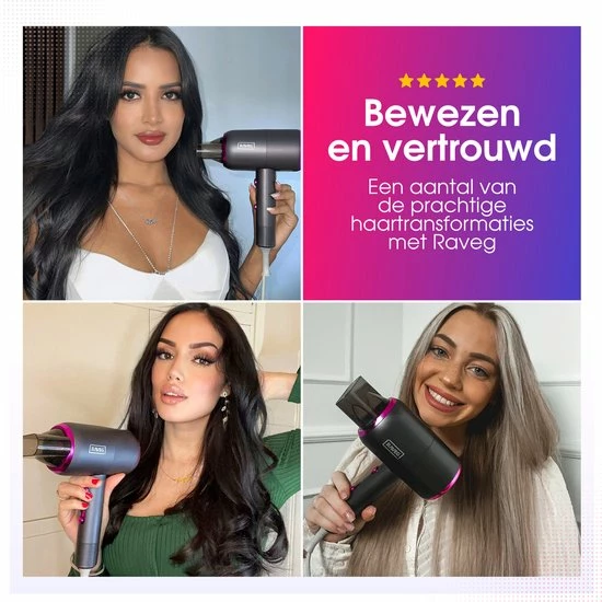 Droog je natte haren op de meest veilige manier met de Raveg föhn. De luxe föhn met diffuser, opzetstukken en ionentechnologie is speciaal ontworpen om 100% veilig te föhnen. Dankzij de motor van 2000W föhn jij je haar in enkele minuten droog. De föhn droogt niet alleen het haar, maar voedt en verzorgt de haarwortels zelfs door de meeste nieuwe technologiën.