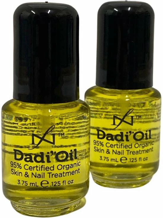Dadi’ Oil is een verzorgende nagelolie die gemaakt is om flexibiliteit, stevigheid en glans te geven aan de natuurlijke nagel, aan nagelproducten en aan de nagelriem! Dadi’ Oil wordt snel opgenomen en is niet vet. Het brengt drie gecertificeerde organische olieën samen. Een gecertificeerde organische olie is een hoogwaardig product afkomstig van boeren die duurzame technieken hanteren en geen kunstmatige mest of bestrijdingsmiddelen gebruiken. Avocado, Olijf en Jojoba olieën werken samen om te beschermen, te hydrateren en te verzachten. Er is natuurlijke Vitamine E (niet synthetische tocopheryl acetaat) toegevoegd, een krachtige anti-oxidant. Dit mengsel van 21 essentiële oliën heeft een aangename geur.