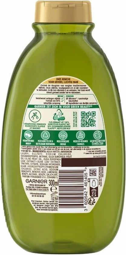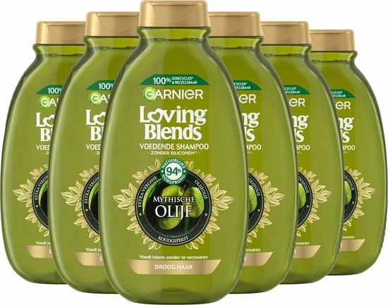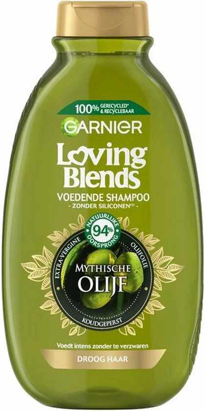 Loving Blends Mythische Olijven Shampoo van 94% natuurlijke oorsprong is een voedende shampoo die droog haar intens voedt zonder te verzwaren. Speciaal voor uitgedroogd haar heeft Garnier Loving Blends een formule samengesteld met Olijfolie. Een intense voeding die het haar herstelt tot in de punten, zonder dat het zwaar wordt. Je haar geeft een intens zacht gevoel en wordt makkelijker om in model te brengen met als eindresultaat een stralende natuurlijke schoonheid. Aanbrengen op vochtig haar, zachtjes in het haar masseren en spoel vervolgens goed uit.