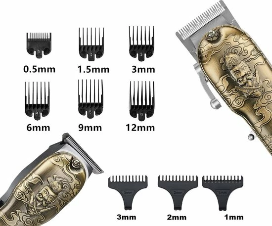 De grote tondeuse wordt geleverd met 6 verschillende opzetstukken waarmee je zelf de lengte van het haar kan bepalen. De verschillende opzetstukken hebben een lengte van 0.5mm, 1.5mm, 3mm, 6mm, 9mm, 12mm.