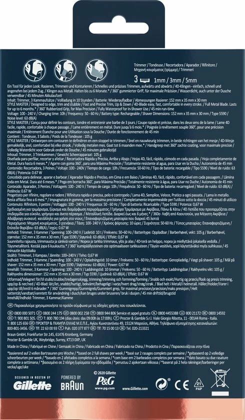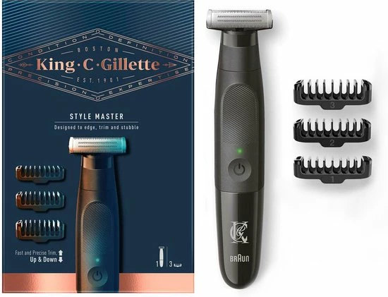De King C. Gillette Style Master is een veelzijdig hulpmiddel ontworpen voor het afwerken van randen, trimmen en bijwerken van een stoppelbaard. Deze draadloze tondeuse heeft een 4D-mesje voor gemakkelijke, snelle en comfortabele bewegingen tijdens het scheren. Met de 3 verwisselbare kamopzetstukken (1 mm, 3 mm of 5 mm) van de Style Master kunt u omhoog of omlaag trimmen. Het heeft een vervangbaar volledig metalen mesje waarmee tot 6 maanden gescheerd kan worden, een flexibele contourkop voor aanpasbaarheid op moeilijk bereikbare plekken en een slanke 360 ÌŠ rubberen grip voor maximale precisie. En hij is volledig waterbestendig met een batterijduur van 45 minuten – handig om onder de douche te gebruiken.