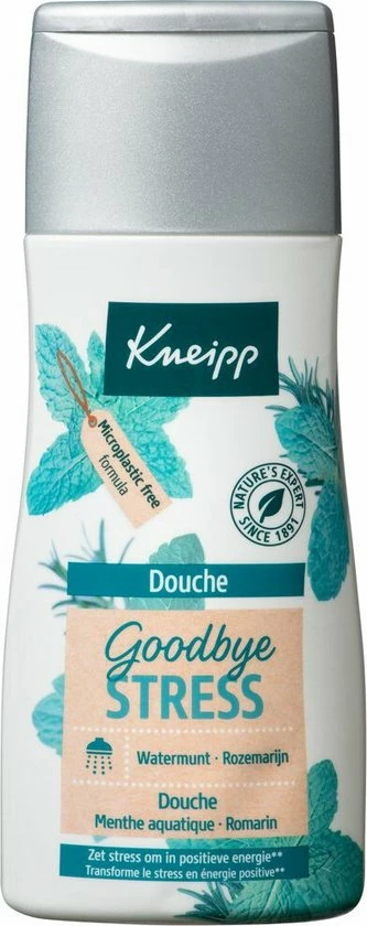 Jouw Kneipp-moment voor het leegmaken van je hoofd. De Kneipp douche Goodbye Stress is mild reinigend en behoudt het natuurlijke vochtgehalte van de huid. De geur met de kracht van etherische oliën zet stress om in positieve energie**. Laat de hectiek van de dag achter je. Goodbye Stress – Welcome Energy! **Bevestigd door wetenschappelijke studie. Op zoek naar een douchegel die zorgt voor een verfrissend en energie opwekkend gevoel? Ga dan voor Kneipp douche Goodbye Stress met natuurlijke watermunt en rozemarijn. De subtiele frisse geur met de kracht van essentiële oliën doet écht iets voor je en dat voel je. Na het douchen bruis je weer van de (nieuwe) energie.