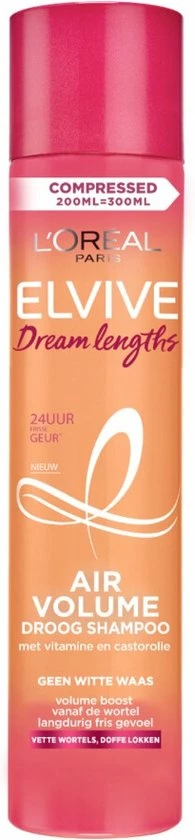 De Elvive Dream Lengths Air Volume Dry Shampoo zorgt voor een onmiddellijke volume boost vanaf de wortels en een langdurig fris gevoel. Dit komt doordat de Air Volume Droog Shampoo vitamine en castorolie bevatten die het haar voeden en reinigen. Zodat jouw haarvet wordt vermindert zonder dat er water aan te pas komt.