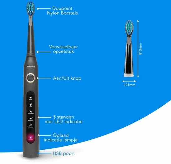 Last van gevoelige tandvlees of gelige tanden? De revolutionaire vibrerende technologie reinigt het gebit doorgrondig en snel. Kies uit 5 standen voor een soft, hard of medium poets ervaring. Geniet dankzij LifeGoods elektrische tandenborstel van een gezonder, sterker en witter gebit! Laad de tandenborstel eens per 3 weken op zonder oplaadstation met de USB kabel.
