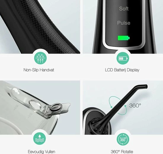 De LifeGoods elektrische waterflosser houdt je gebit sterk en gezond. 1400 tot 1800 waterpulsen per minuut verwijderen 99,99% van alle voedselresten en tandplak. Ideaal voor mensen met een beugel! De flosser kan veilig gebruikt worden onder de douche (IPX7 waterproof rating). De ingebouwde 1400 mAh lithium batterij gaat tot 20 dagen mee op een volle accu en is op te laden via USB of stopcontact. Ervaar het verschil met enkel poetsen!