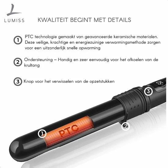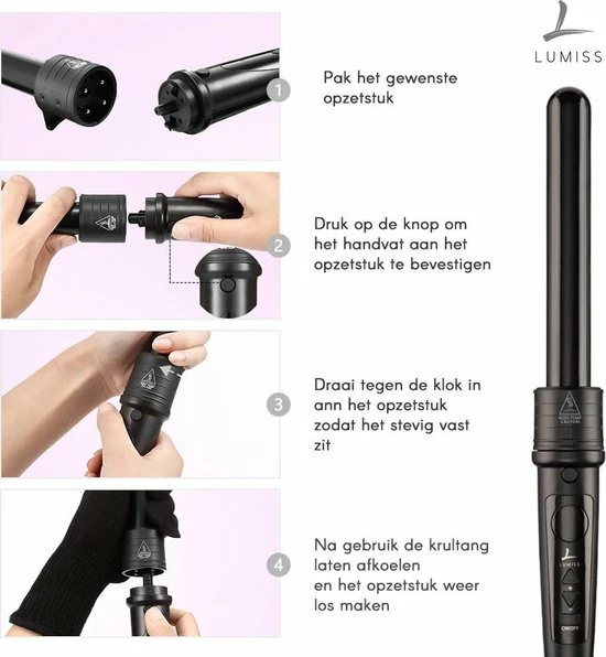 Met de Lumiss Sublime Pro kan je simpel afwisselen met verschillende temperaturen en kan je vanuit meerdere posities een mooie bos krullen maken. En de 5 opzetstukken zorgen ervoor dat je handig en flexibel zelf krullen kan maken waarvan je een lach op je gezicht krijgt!