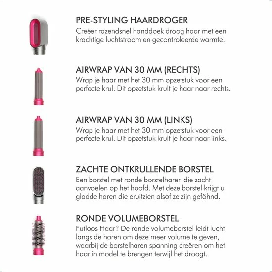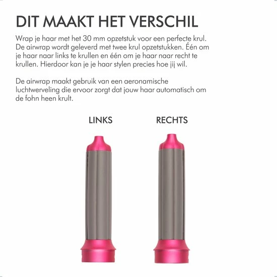 De draaikolk van de krultang trekt de haren automatisch aan en wikkelt ze om het opzetstuk waardoor jouw haren een prachtige gekrulde vorm krijgen. Hierdoor hoef jij zelf niet lastig pluk voor pluk het haar om de krultang te draaien maar wordt dit voor jou gedaan. Voor het maken van de krullen zijn er 2 opzetstukken waarbij bij de één de luchtstroming linksom draait en de ander rechtsom. Daarnaast maak jij met de föhnborstel je haar prachtig glad voor het stijlen om de hele dag het haar fantastisch in model te hebben.