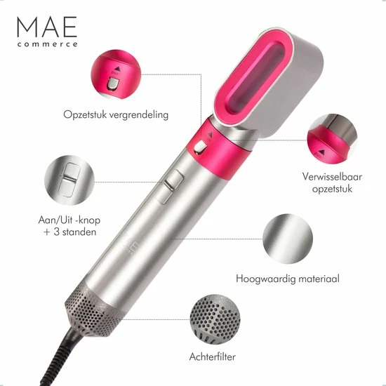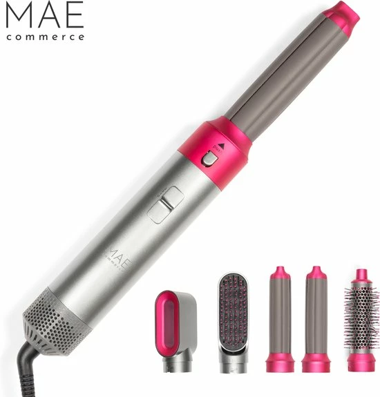 Prachtige volle krullen en een volumineus kapsel in een handomdraai met de MAE airstyler! Met de nieuwste technologie een voorloper op de oude technieken zodat jij verzekerd bent van de allerbeste kwaliteit. De multistyler heeft 5 opzetstukken om jou haar fantastisch in model mee te brengen. De ene dag ga je voor schitterende krullen, de andere dag voor beachy waves of gestijld haar. De airstyler is zeer eenvoudig in gebruik en is te gebruiken op zowel nat als droog haar. De MAE airstyler is vergelijkbaar met de Dyson alleen is de luchtstroming iets minder krachtig.