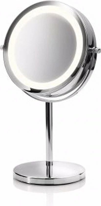 Met deze Medisana CM 840 – Make-up spiegel kan dagelijkse gezichtsverzorging thuis nu net zo professioneel worden uitgevoerd als bij de schoonheidsspecialist. Dankzij het grote spiegeloppervlak die de reflectie tot maar liefst 5x vergroot en de uniforme verlichting in de vorm van een ring met energiezuinige witte LEDs, is een poriën diepe en zeer nauwkeurige verzorging mogelijk. De cosmeticaspiegel staat stevig op een stabiele voet en is dankzij de 4 AAA batterijen toch overal te plaatsen waar gewenst. Voor een comfortabele gezichtsverzorging hoef je dus niet meer ver voorover gebukt te zitten of te manoeuvreren in een ongemakkelijke positie: de Medisana Cosmeticaspiegel zorgt voor het perfecte gezichtsbeeld op de perfecte plaats