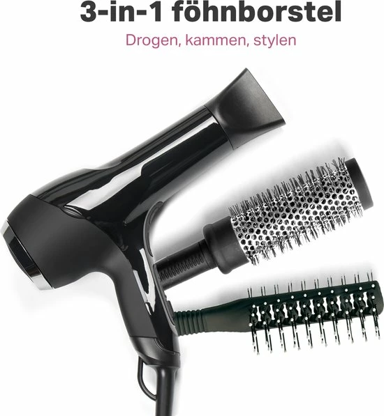 Stijl en droog jouw haar in een mum van tijd met deze 1000W Föhnborstel. Het grote formaat van deze borstel zorgt voor een snel droogresultaat. Je kan tijdens het drogen tegelijkertijd je haren stijlen, volume creëren, een slag aanbrengen en mogelijk een klein krulletje creëren.