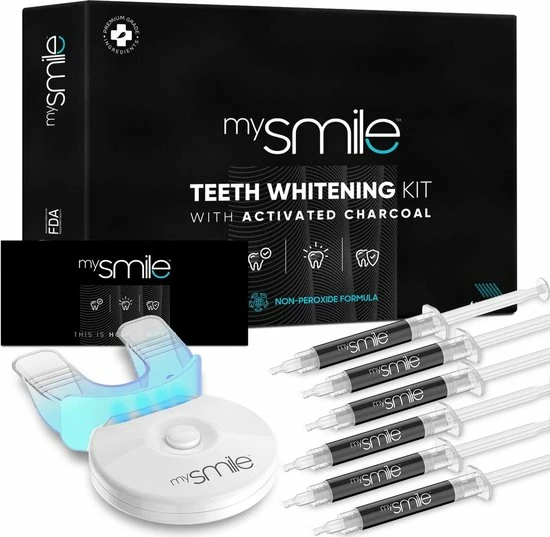 De mysmile tandenbleekset is de beste manier voor een witte glimlach. Deze eenvoudig te gebruiken tandenbleekset is gemaakt met natuurlijke ingrediënten zoals activated charcoal en voldoet aan de strenge Europese regelgeving. mysmile kan vlekken en verkleuringen verwijderen veroorzaakt door rode wijn, roken, koffie, thee en veel meer. Deze set bevat geen peroxide en is volledig veilig voor je gebit en mond.