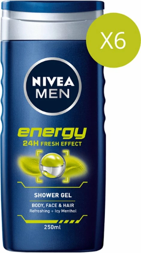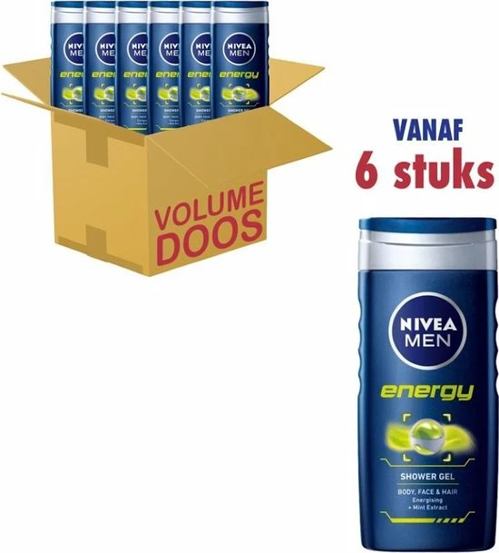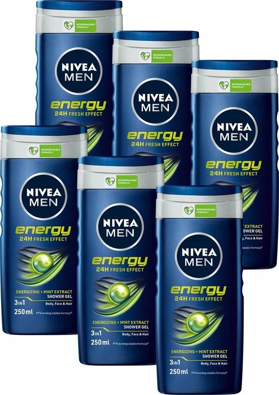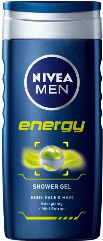 NIVEA MEN Energy douchegel. VOOR MANNEN die een energieboost willen onder de douche met intensieve verzorging voor de huid. De 3-in-1 douchegel voor lichaam, gezicht en haar met activerend mint-extract is de beste manier om je lichaam en geest een energy boost te geven. Geef jezelf nieuwe energie na elke douche.