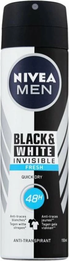 NIVEA MEN Invisible for Black & White Fresh Anti-Transpirant, de eerste anti-transpirant die effectief 48 uur tegen transpiratie beschermt én jouw kleding beschermt tegen witte strepen op zwarte kleding en gele vlekken in witte kleding. Dus: zwart blijft zwart en wit blijft langer wit, zodat je favoriete kleding er langer goed uit blijft zien. Met een extra frisse sensatie. Nu kom jij zelfverzekerd de hele dag door met betrouwbare bescherming!