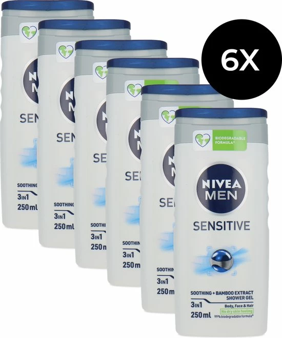 NIVEA MEN Sensitive Douchegel. VOOR MANNEN die een verzachtende douche willen met een intensieve verzorging van de gevoelige huid. De 3-in-1 douchegel voor lichaam, gezicht en haar is de beste manier om je huid te verzachten. Voor een voelbaar zachte huid na elke douche. De formule is 99% biologisch afbreekbaar * en de fles is gemaakt van tot wel 97% gerecycled materiaal **