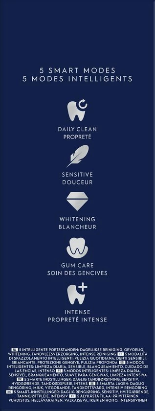 - 5 slimme poetsstanden om uw poetsbeurt te personaliseren: Dagelijkse reiniging, Gevoelige tanden, Tandvleesverzorging, Intense reiniging, Whitening