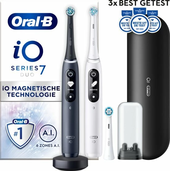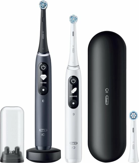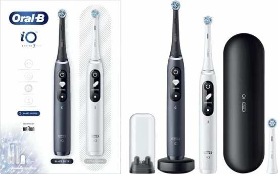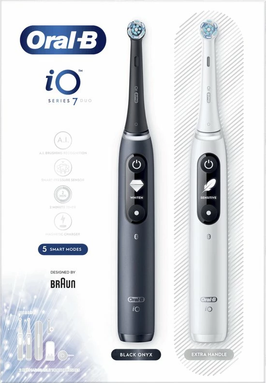 - Bevat: 2 iO7-handvatten met 2 ultimate clean opzetborstels, 1 premium reisetui, 1 oplader, 1 opzetborstelhouder