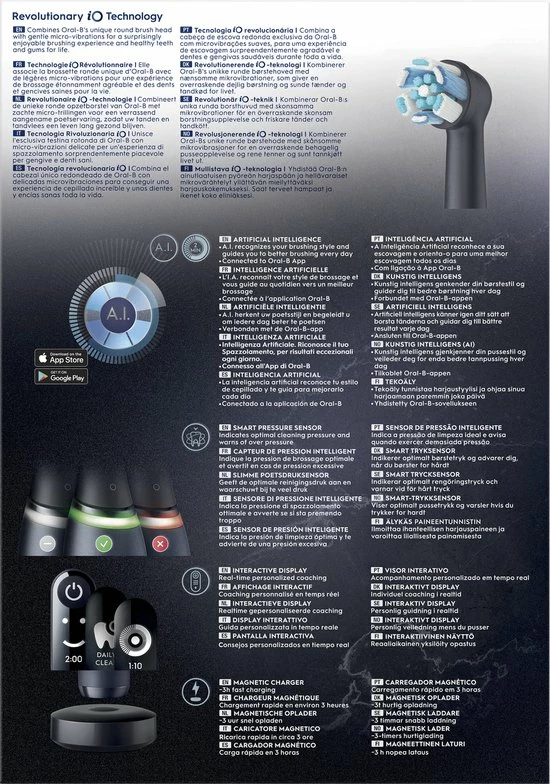Oral-B heeft zijn uiterste best gedaan om een poetservaring te creëren die alle klassen overtreft. Meer dan alleen een vooruitgang in technologie om techniek van wereldklasse te integreren – voor de meest grondige, zachte en stille reiniging van uw leven. Meer dan design om een echt toestel van verlangen te creëren – met een strakke look voor de meest gewilde technologie. Als u van een manuele naar een elektrische tandenborstel overschakelt, poetst u uiteraard beter. Maar als u van een elektrische tandenborstel naar een iO overschakelt, gaat u van een gewone naar een werkelijk buitengewone ervaring die u op een andere manier ziet, hoort en voelt.