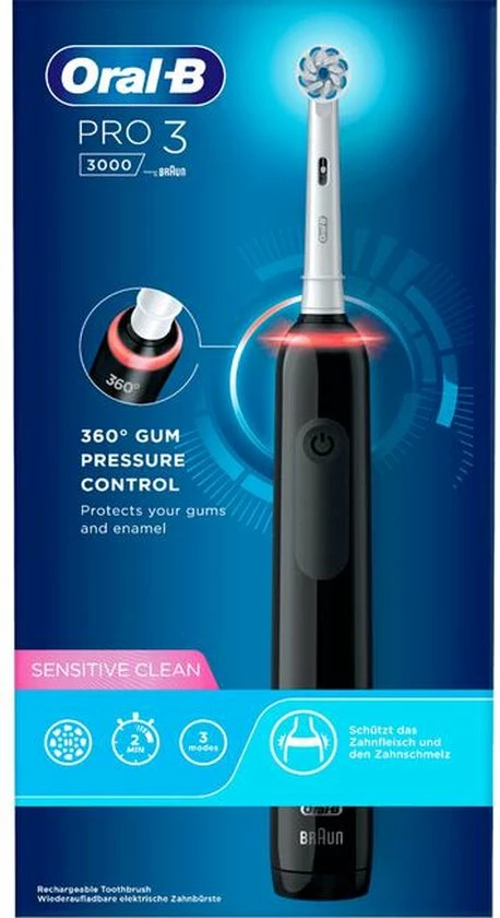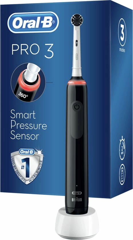 Ervaar de Oral-B Pro 3 van het nummer een meest gebruikte tandborstelmerk door tandartsen wereldwijd. Het slanke handvat van de Pro 3 elektrische tandenborstel helpt u te poetsen zoals uw tandarts dat aanbeveelt: Het helpt u 2 minuten poetsen met de professionele timer en meldt u om de 30 seconden dat u een andere zone moet poetsen. U beweegt de borstel gewoon in uw mond en de unieke, ronde borstelkop van Oral-B doet de rest. Dankzij borstelharen met houtskool reinigt deze 100% meer tandplak dan een gewone manuele tandenborstel. Dat is niet alles, de tandenborstel helpt u ook uw gevoelige tandvlees te beschermen met de poetsdrukcontrole die de poetssnelheid vermindert en u waarschuwt als u te hard poetst. De Oral-B Pro 3 tandenborstel is onmisbaar voor iedereen die naar een elektrische tandenborstel wil overschakelen en zijn mondgezondheid wil verbeteren.