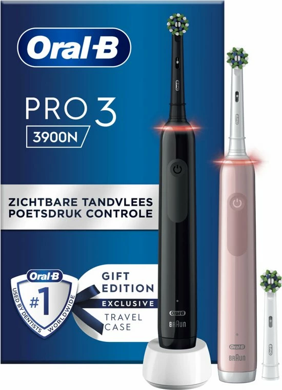 De Oral-B Pro 3 heeft een ronde opzetborstel die elke tand omsluit voor schonere tanden en gezonder tandvlees; hij verwijdert tot 100% meer tandplak dan een handtandenborstel.