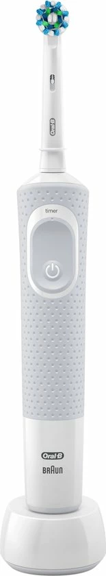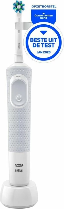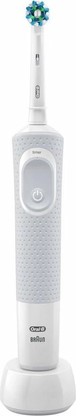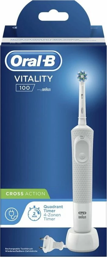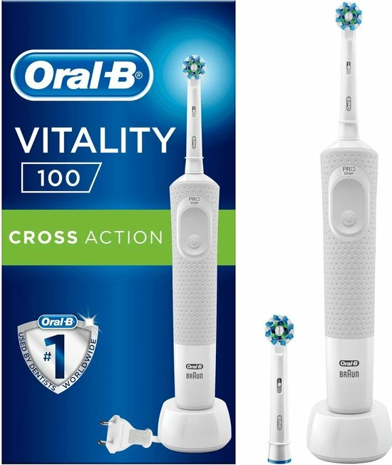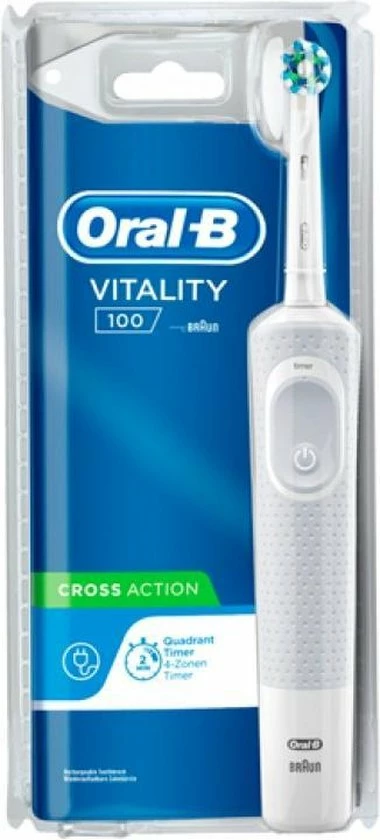 De Oral-B Vitality 100 CrossAction elektrische tandenborstel biedt een klinisch bewezen superieure reiniging in vergelijking met een gewone manuele tandenborstel. De CrossAction borstelkop omhult elke tand met borstelharen die in een hoek van 16 graden zijn geplaatst en de 2D-reinigingsactie oscilleert en roteert om zo meer tandplak te verwijderen dan een gewone manuele tandenborstel. De geïntegreerde timer op het handvat helpt u 2 minuten te poetsen zoals door tandartsen wordt aangeraden. Bovendien wordt deze elektrische tandenborstel aangeboden door Oral-B, het merk dat het meest door tandartsen wereldwijd wordt gebruikt. Past op de volgende vervangende opzetborstels: Cross Action, 3D White, Sensi Ultrathin, Sensitive Clean, Precision Clean, Floss Action, Tri Zone, Dual Clean, Power Tip, Ortho Care.