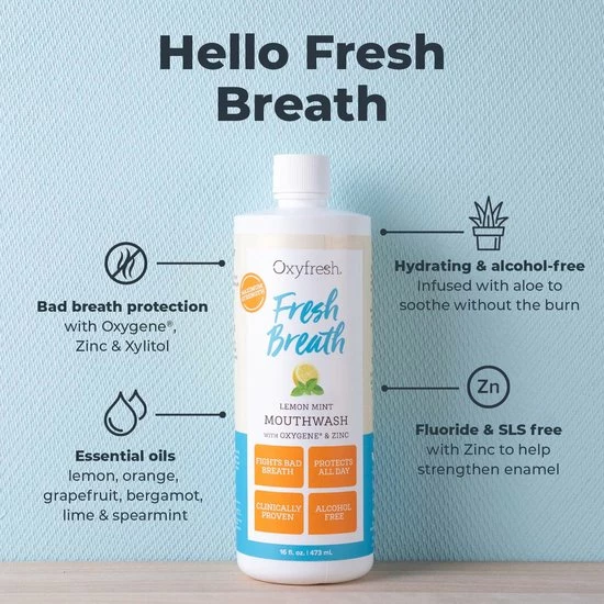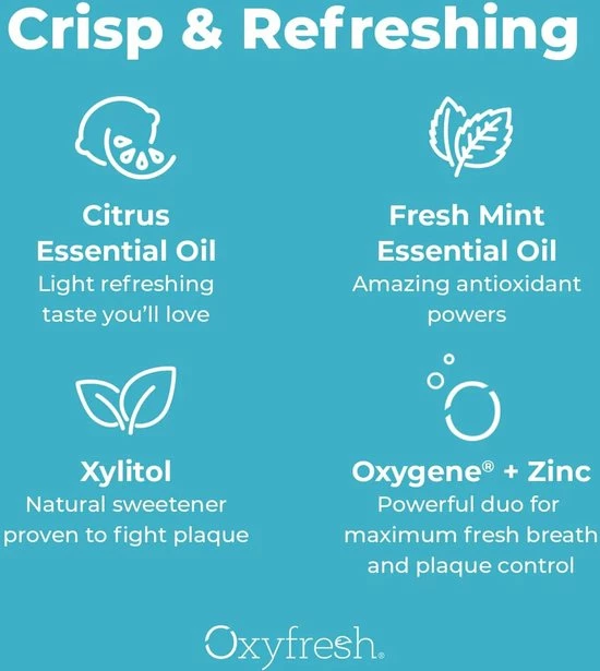 De gepatenteerde en speekselstimulerende formule van Oxyfresh mondwater bestaat uit een unieke combinatie van Oxygene® en zink, dat slechte ademgassen volledig neutraliseert en tegelijkertijd de bacteriën uitschakelt die verantwoordelijk zijn voor cariës, tandvleesproblemen, tandsteen en aanslag op de tong.