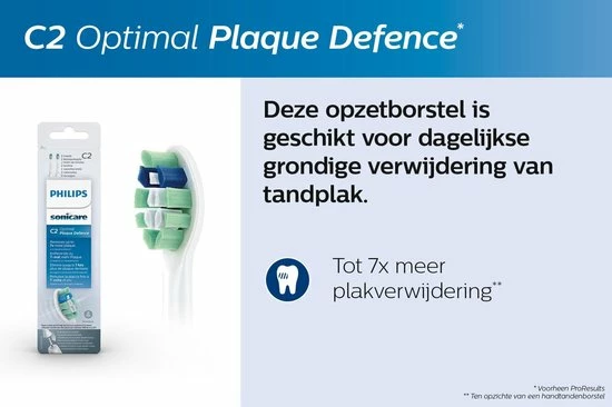 De Philips Sonicare C2 Optimal Plaque Defence-opzetborstel (voorheen ProResults plaque control) is perfect voor mensen die optimale plakverwijdering willen als onderdeel van hun dagelijkse mondverzorgingsroutine.
