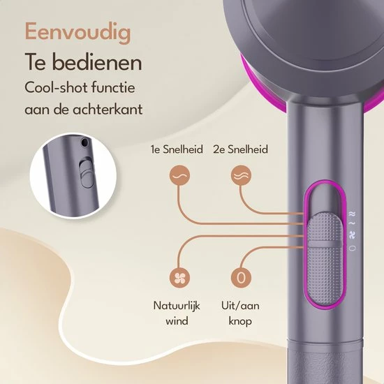De haardroger wordt geleverd met een diffuser en twee concentrators, waarmee je in een handomdraai een perfect gestylde coupe kunt creëren. De diffuser is ideaal om je natuurlijke krullen te drogen en met de concentrators blaas jij je steile lokken prachtig in model. Zo kun je gewoon thuis net zo’n mooi resultaat als bij de kapper behalen.