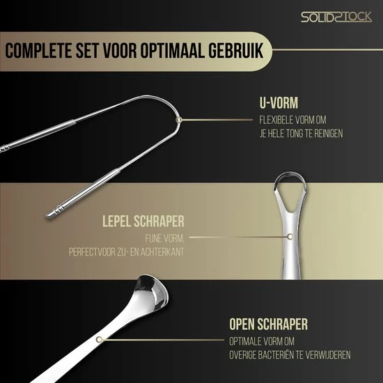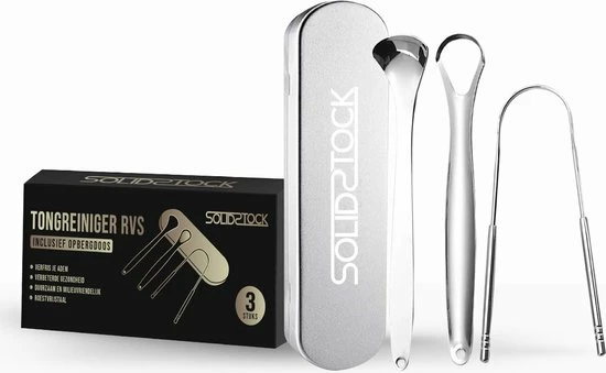 Heb jij ook last van een slechte adem? Grote kans dat deze wordt veroorzaakt door de witte aanslag op je tong. Verwijder eenvoudig alle bacteriën en aanslag met deze professionele tongschraper set van SolidStock en heb altijd een frisse adem. Het roestvrijstalen materiaal maakt de reiniger niet alleen erg effectief in gebruik, maar zorgt ook voor een duurzaam jarenlang gebruik.