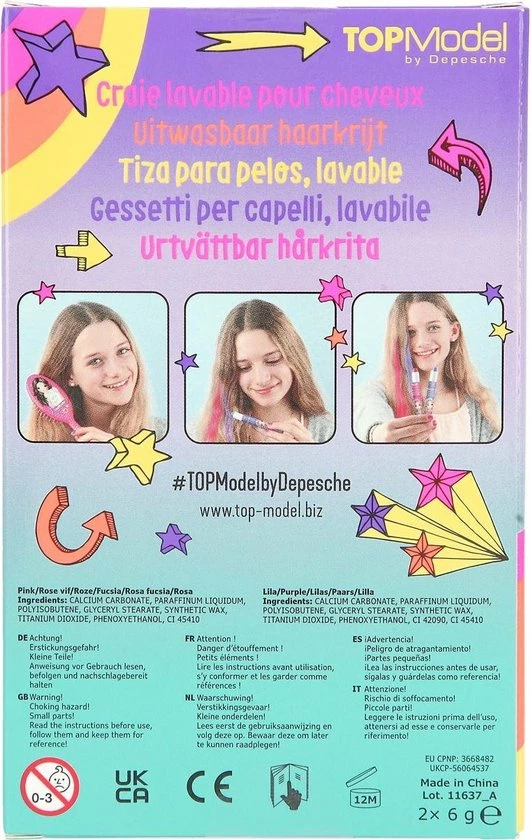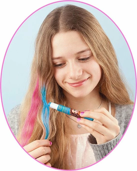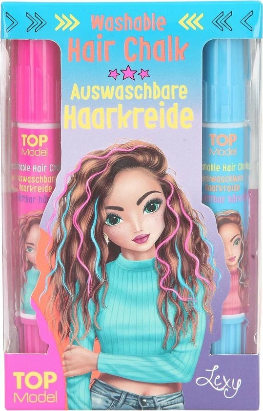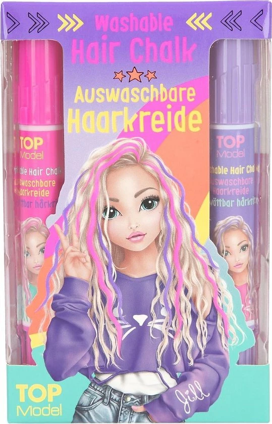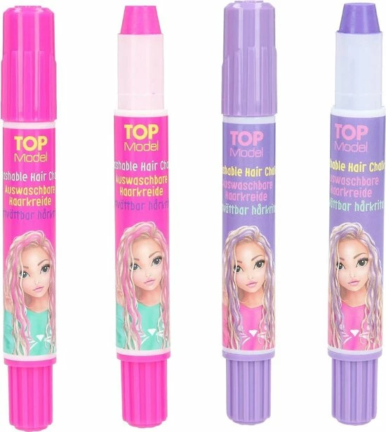 Voor coole kapsels: de haarkrijt stiften van TOPModel zijn er in roze en blauw of roze en paars. Ze zijn makkelijk in gebruik en net zo makkelijk weer uit te wassen. Inhoud per stift: 6 g.
