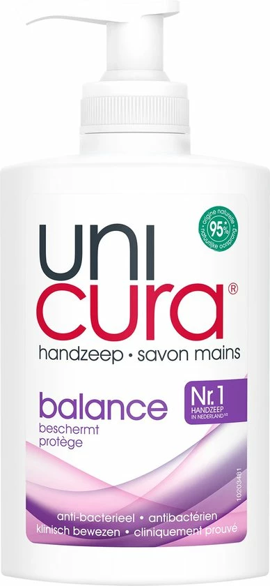 De klinisch bewezen Unicura Balans antibacteriële handzeep is speciaal ontwikkeld om elke dag te zorgen voor schone handen. De formule met een antibacterieel ingrediënt beschermt je handen effectief tegen elke vorm van bacteriën die je tegenkomt tijdens je dagelijkse bezigheden. De handzeep zorgt ook voor een zachte en soepele huid en voor een complete en gebalanceerde verzorging. Unicura Balans antibacteriële vloeibare handzeep heeft een frisse en aangename geur die lang rond je handen blijft hangen zodat ze elke dag lekker blijven ruiken.