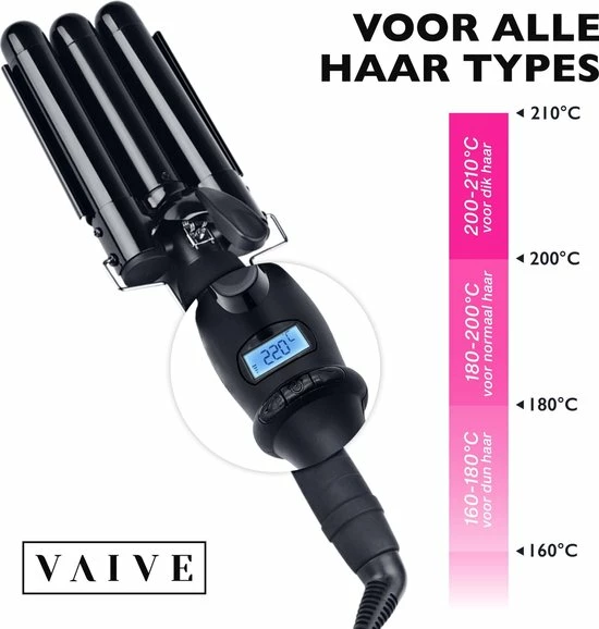 De drie tangen werken in optimale temperaturen samen om jou van een wonderbaarlijk resultaat voorzien. Ga je voor golvend haar of toch voor strakke, losse of zelfs bouncy krullen? Stel gemakkelijk een temperatuur tussen de 140ºC en 220ºC op het digitale display, en kijk wat bij jouw haar past. En heel belangrijk, stijl gerust jouw haar. De keramische coating van de golvenkrultang geeft bescherming aan jouw waardevolle haar. Dus ga aan de slag en VAIVE your waves.