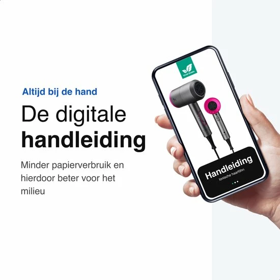 Inhoud: 1x Haarföhn, 3x Opzetstukken (waarvan 1x diffuser), 1x Opbergzakje, 1x Digitale handleiding