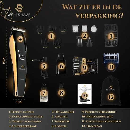 De Wellshave baardtrimmer en bodygroomer zijn 5 opzetstukken bijgeleverd om jezelf ideaal te kunnen verzorgen. Ook is er een travelbag en opzetstuk met draaiwiel van 1mm t/m 9mm inbegrepen! De gehele trimmer is spatwaterdicht. Stuk voor stuk zijn de opzetstukken afwasbaar. Natuurlijk zijn we ook voorzien van een trimmer standaard waarin je alle opzetstukken, lader en trimmer in/op kwijt kunt. De trimmer bevat een Ni-HM batterij. Laadt de trimmer 3 uur op en heb er 1 uur plezier van!