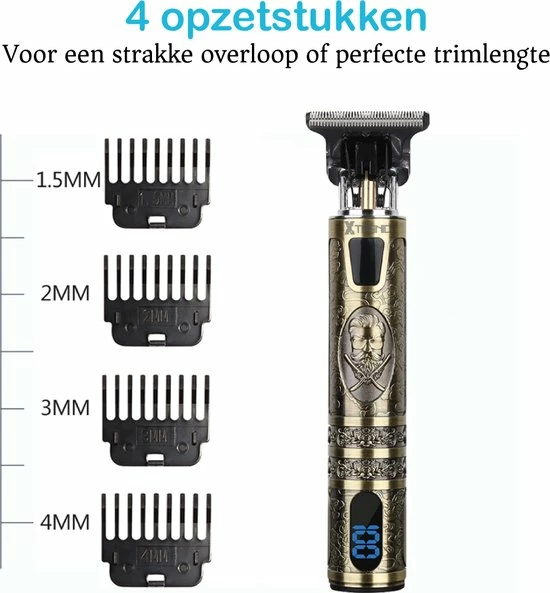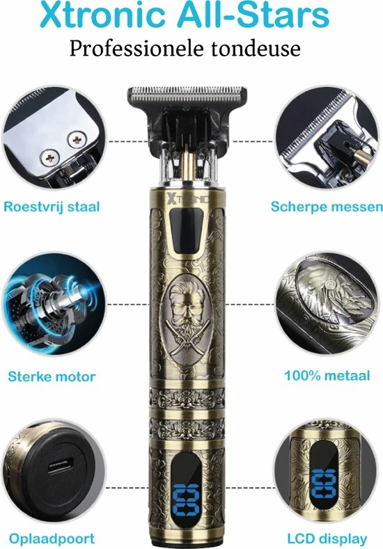 De Professionele Xtronic All-Stars Tondeuse is een trimmer die veelzijdig inzetbaar is. Met de 4 hulpstukken is dit de ultieme alles-in-één trimmer voor het lichaam, gezicht en haar. (1: roestvrij metalen trimmer, 2: bodyshave met bescherming voor de huid, 3: precisiestrimmer en 4: precisiescheerapparaat. Met behulp van de 4 opzetkammen van 1.5mm, 2mm, 3mm en 4mm kan je prachtige overlopen in het haar zetten of de baard precies op lengte trimmen.
