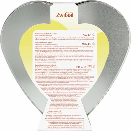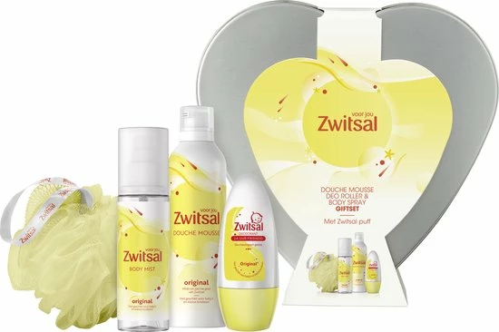 • De geschenkset bevat de Zwitsal Original Doucheschuim, de Zwitsal Original Body Mist en de Zwitsal Original Deo-roller. Verpakt in een handig hartblik.